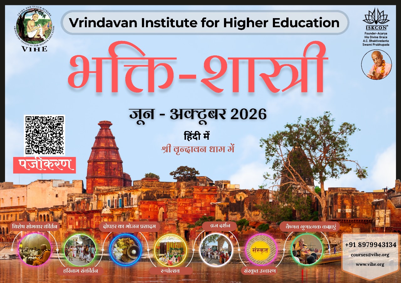 Special features of the course:The VIHE Bhakti-sastri course is an intensive course with 2 classes (of up to 2 hours each) per day Tuesday to Friday and 1 class on Mondays and Saturdays. The course includes classes, sloka memorization, essays and exams. There are also japa sessions, value classes, dhama darsana, and festivals. The classes will take place in Sri Vrndavana Dhama, ISKCON Goshala Land, VIHE building.