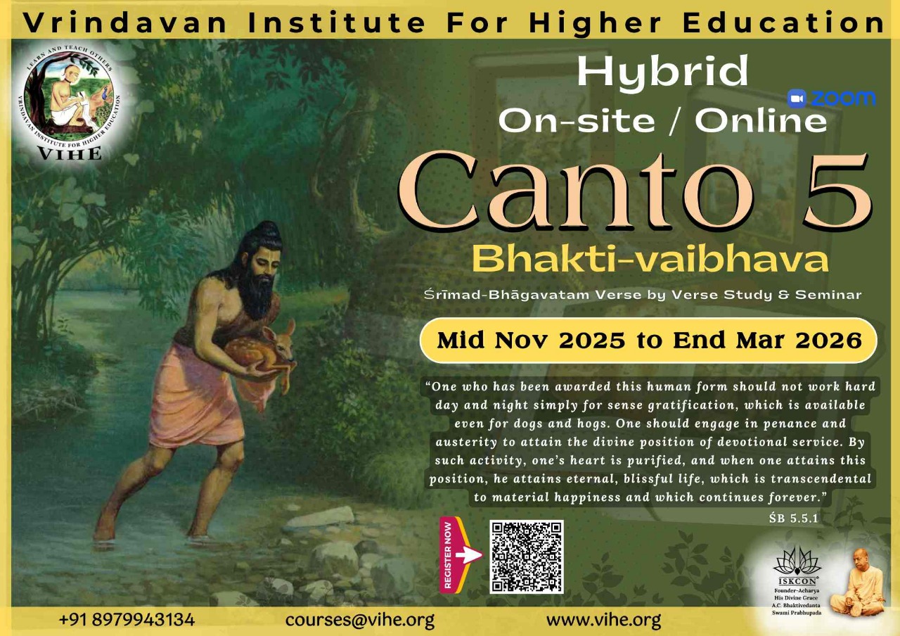 Special features of the course:The VIHE Bhakti-vaibhava course Canto 5 is an online / on-site Hybrid course with 1 class (of up to 2 hours) Monday to Friday (11am - 1pm IST), and sometimes on Saturday morning 11 to 1pm. There will be 2 to 3 additional weekly classes of 2 hours each for memorization of verses, group work, and presentations by students. There are also japa sessions, value classes, dhama darsana, and festivals.